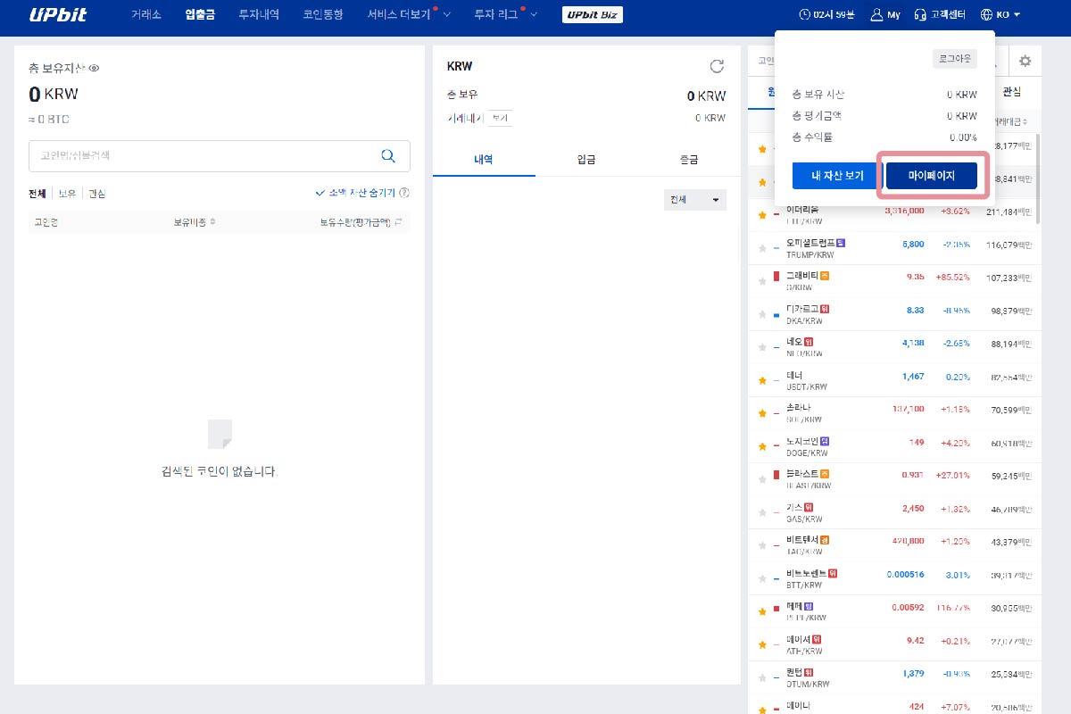 1. 업비트 접속 후 로그인 후 우측 상단 프로필 메뉴에서 마이페이지 이동