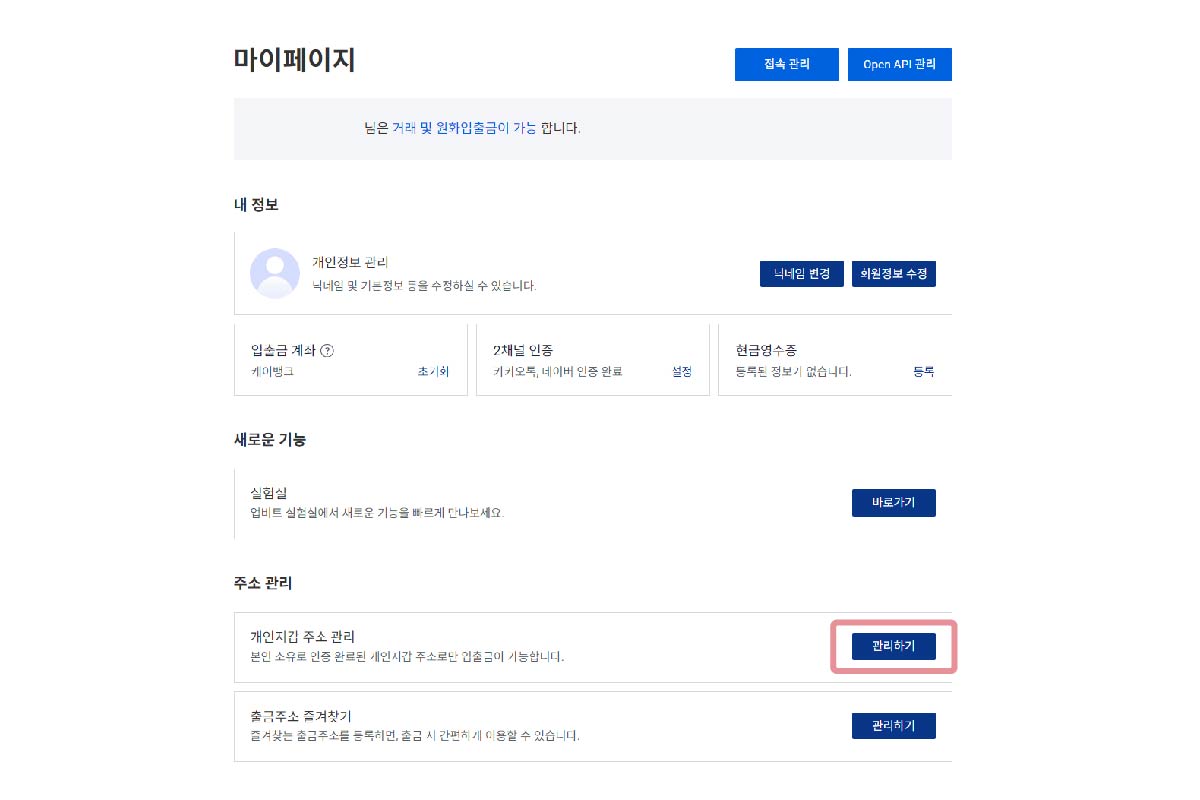 마이페이지 하단의 [개인지갑 주소 관리 → 관리하기] 버튼을 클릭