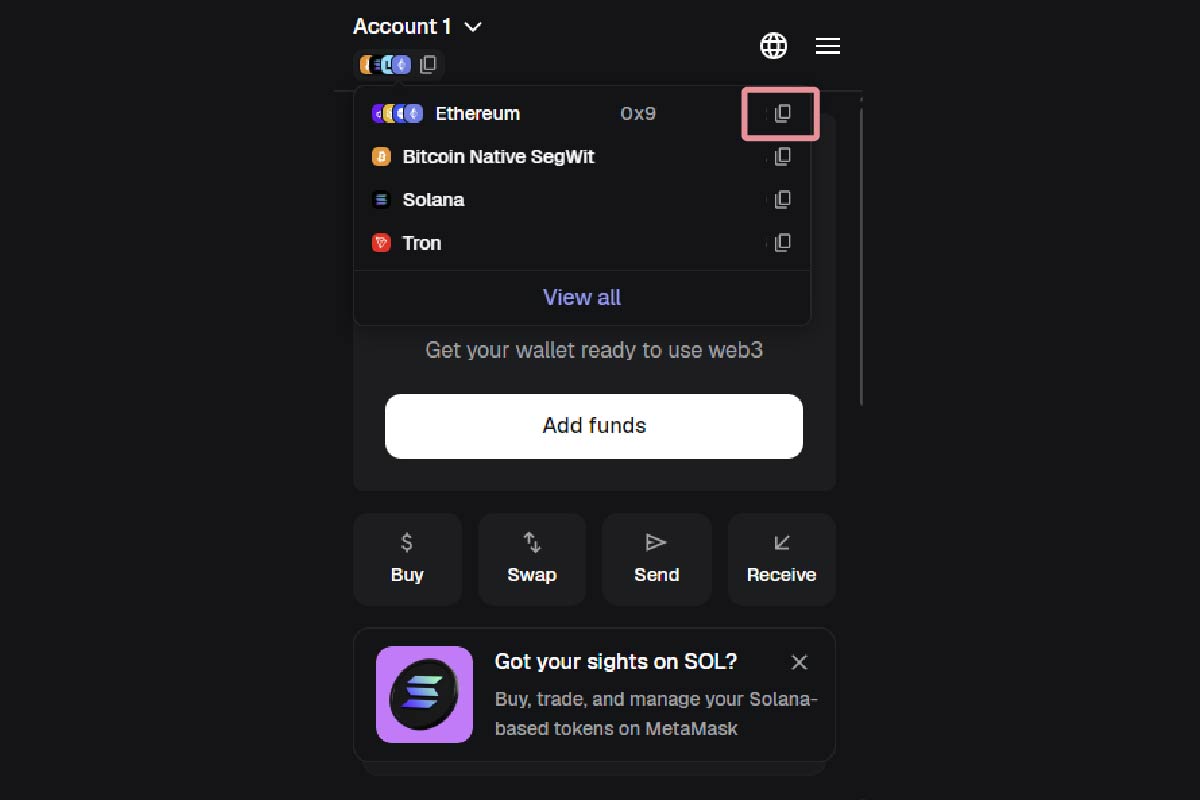 이더리움 주소 우측 복사 아이콘을 눌러 나의 주소를 복사