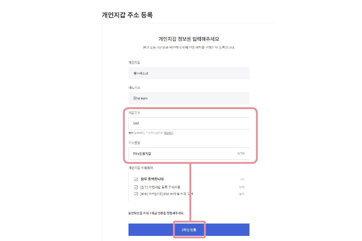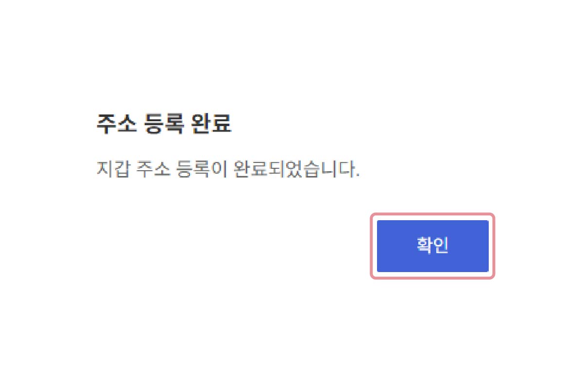 10. 지갑 주소 등록 완료 화면이 나오면 [확인] 버튼 클릭