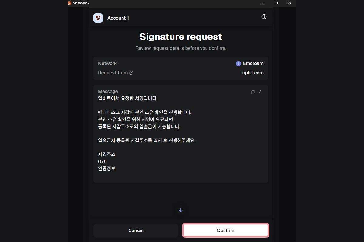 8. 메타마스크 팝업에 서명 요청 확인