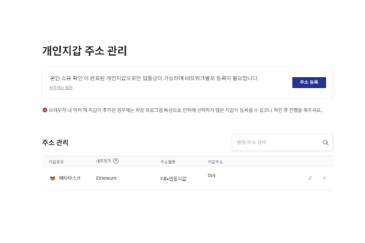 이후 주소 관리 목록에서 등록된 지갑을 확인할 수 있습니다.