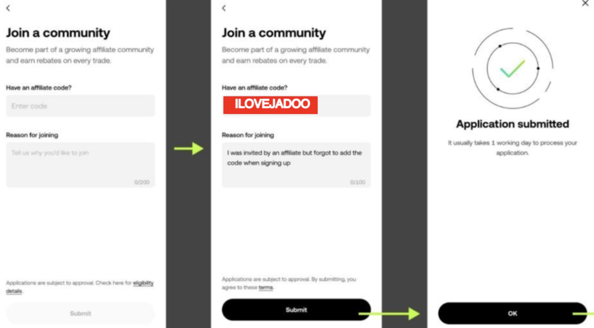 이유 : [I was invited by affilate but forgot to add the code when signing up] 작성합니다.